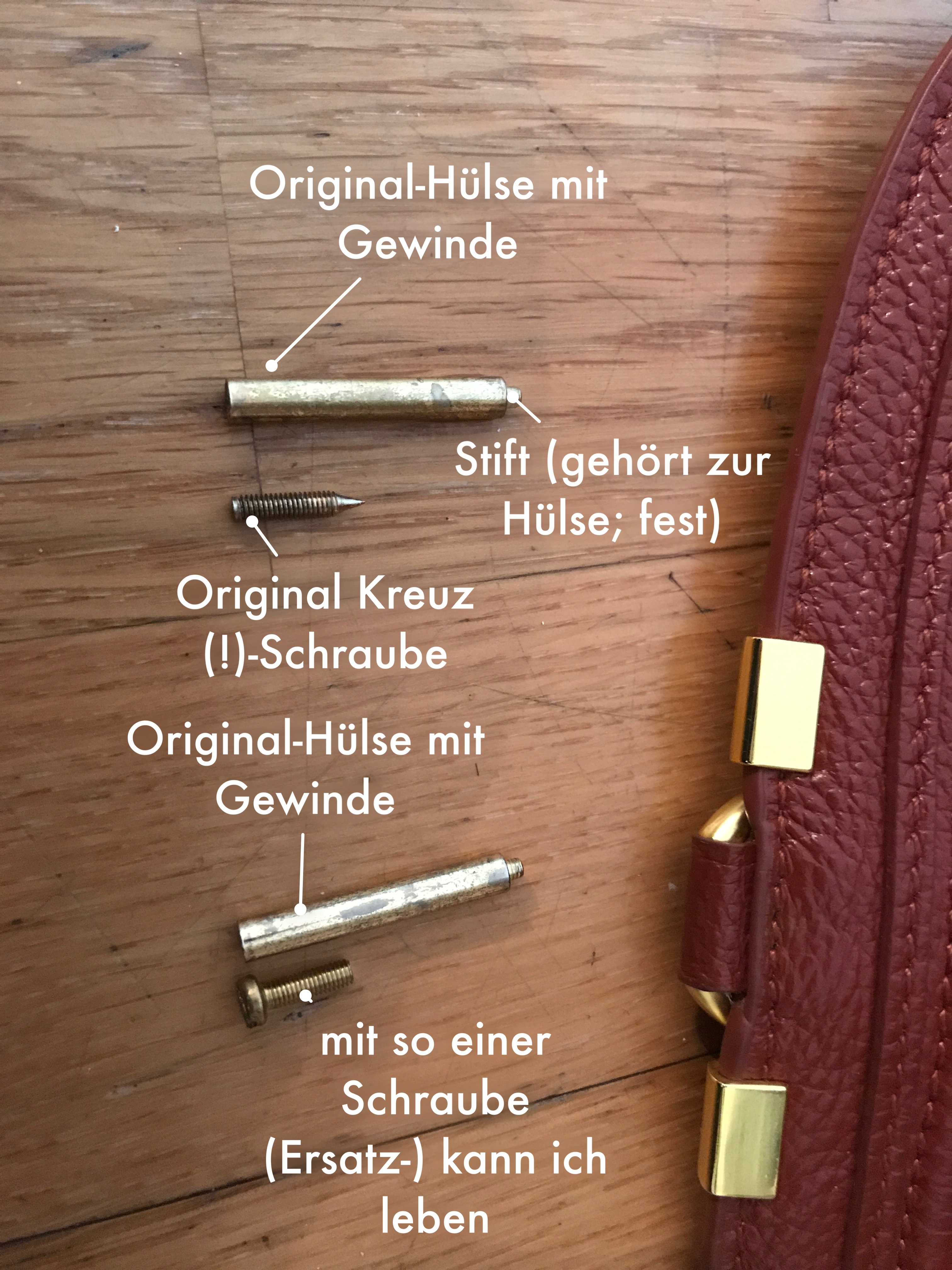 Und eine auf die passende Länge (und dann gefeilte, damit man sie wieder schrauben kann) gekürzte (sägen… ) Schraube - die aber den Nachteil hätte, daß sie durch die Schärfe das Leder verschleißen würde - geht nicht? Durchmesser? Gang?