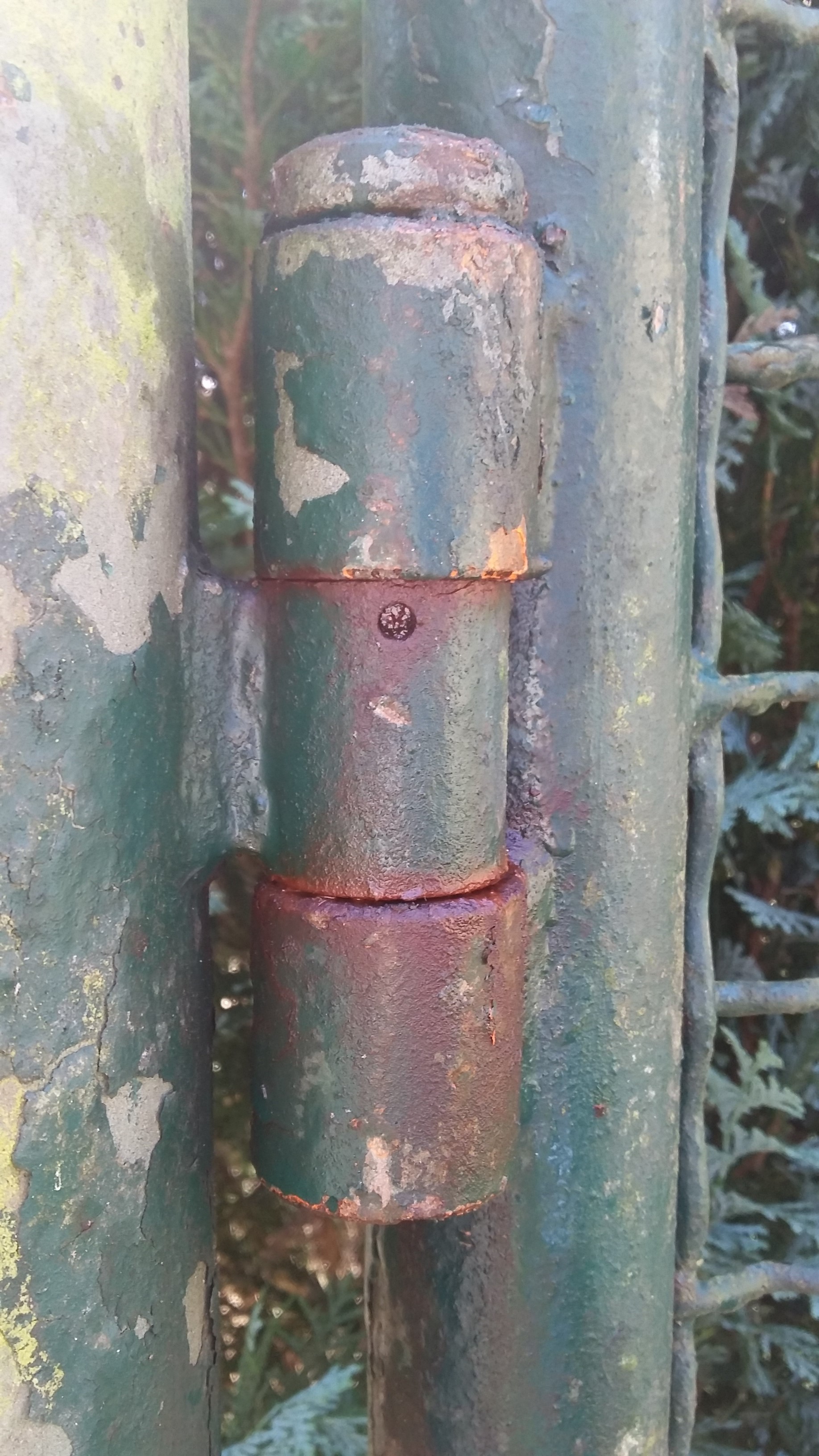 ich möchte 2 Flügel eines Tores aushängen, da sie zum Sanstrahlen gebracht werden sollen. Die Haltebolzen sind allerdings schon seit ca. 40 Jahren drinnen, mit 3 Farbschichten überlackiert und stellenweise eingerostet (siehe Bilder unten). Ich habe alle Schlitze und Öffnungen mit WD 40 eingesprüht und später auch Schmieröl versucht, um sie zu lösen. Ich habe versucht die Bolzen von unten nach oben mit einem passenden meisel und Fäustel rauszuschlagen - sie bewegen sich nicht 1 mm - auch nicht mit brachialer Gewalt.