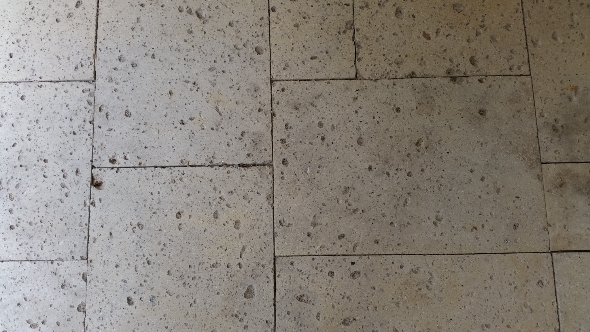 Nach den vielen unterschiedlichen Fotos könnte es doch ein Natursteinen sein - ein Travertin. Vorausgesetzt, die schwarzen und grauen Punkte und Grate sind in Natura Vertiefungen. Travertin - eine Art Marmor- wurde in den 70ern und auch 80ern gerne für Bodenbeläge innen und außen sowie Frontverkleidung von Gebäuden genommen. Ist im Prinzip ziemlich haltbar. Kirche oder gar Säuren wären aber kontraproduktiv.