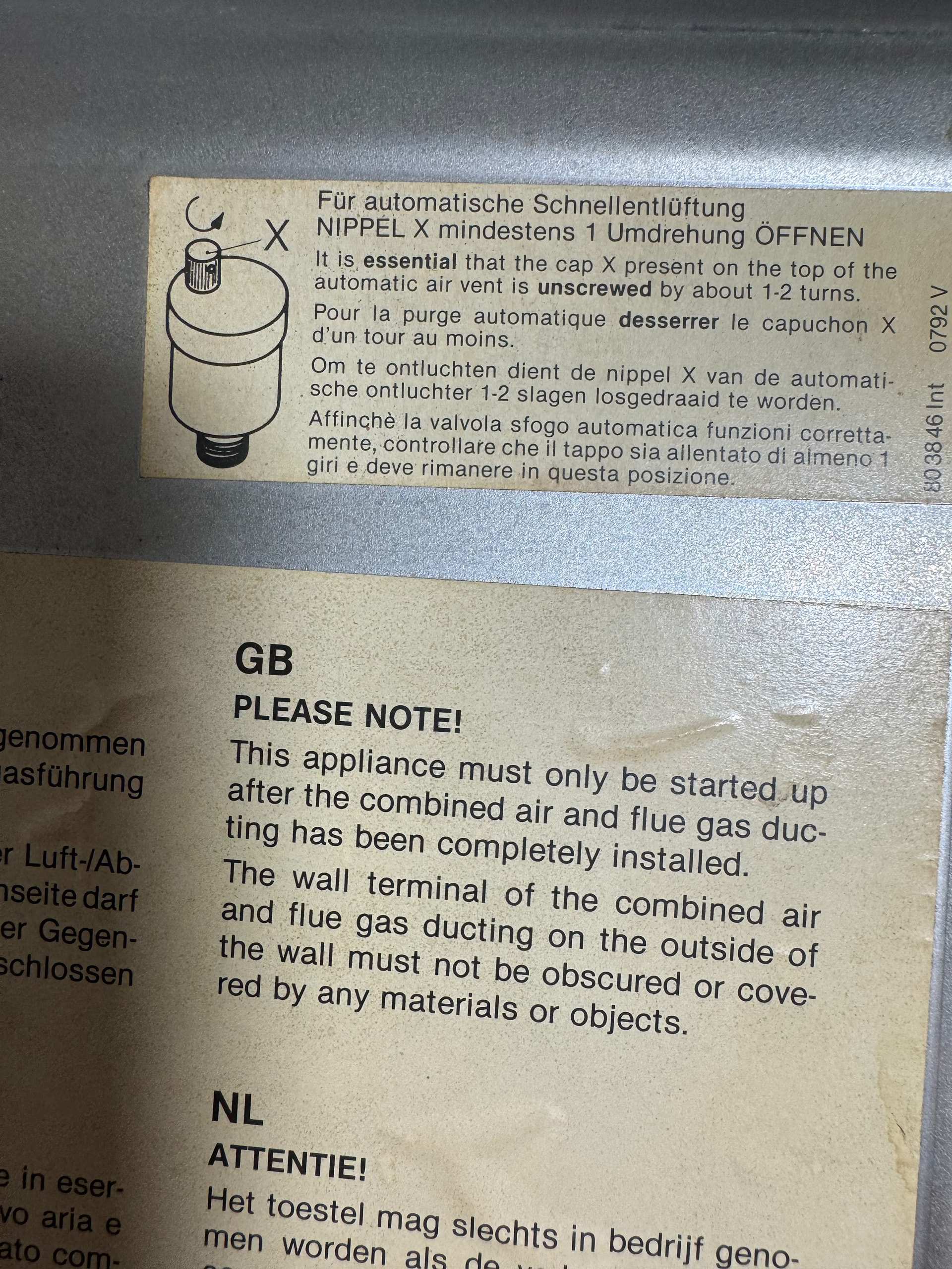 Leider ist bei meiner Therme das Wasser leer gewesen und sie hat sich ausgeschaltet inkl das bedienfeld (siehe Bild) kann leider nicht genau sagen welcher Typ es ist aber habe genug Bilder gemacht . Dort steht auch schnell entlüften leider bin ich wohl nicht talentiert genug es selber zu finden . Sie versucht nach Drücken des Pins anzuspringen leider ohne Erfolg