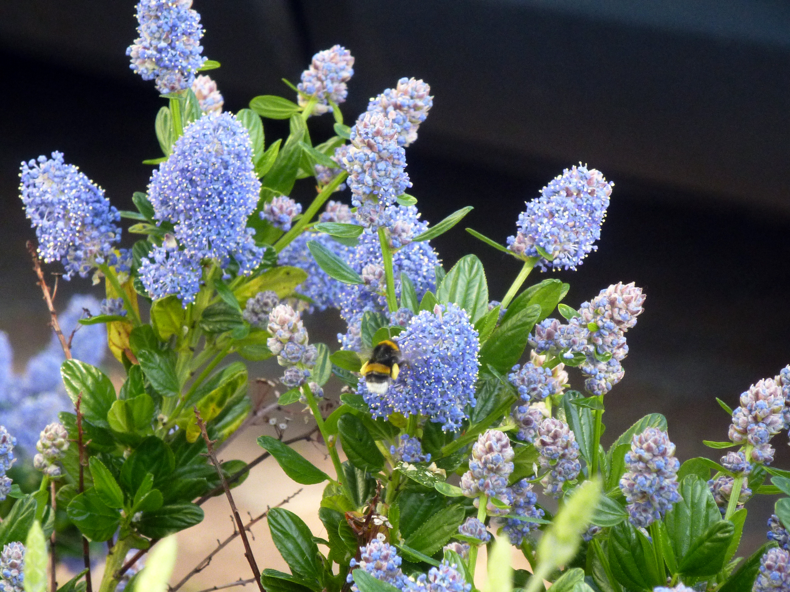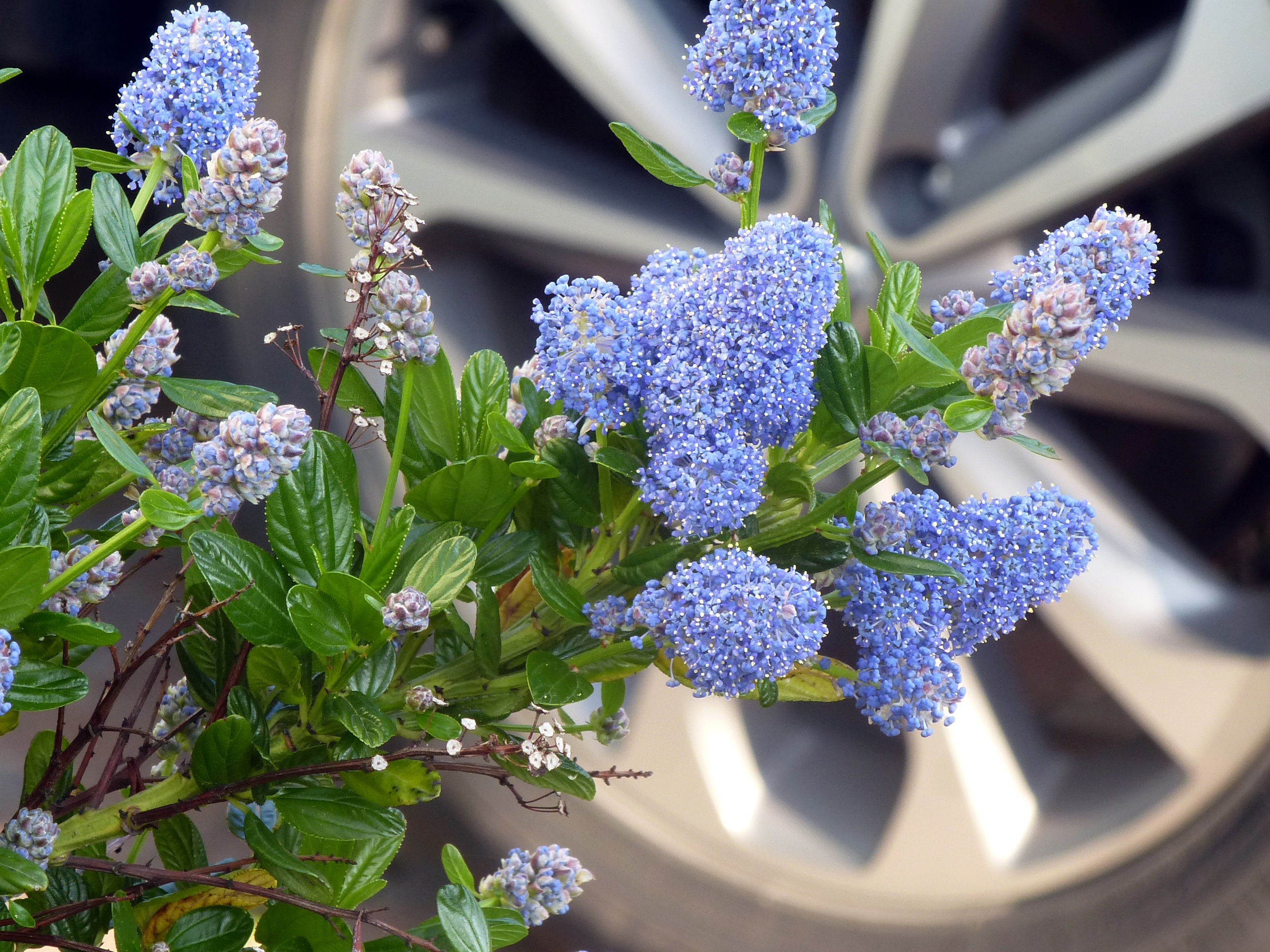 Ich habe in einem Garten einen kleinen immergrünen (!) Strauch gesehen, der jetzt lila blüht. Die Blätter sind glattrandig mit gänzender Oberfläche, ca. 1 cm und mich fasziniert, dass er wintergrün ist und so schön blüht. Auf dem Foto sieht man voll aufgebrühte Blütenstände und andere, die sich erst noch öffnen, verblüht ist noch keine. Der Strauch ist im Moment weniger als 1 m hoch, wie schnell er wächst, weiß ich nicht.
