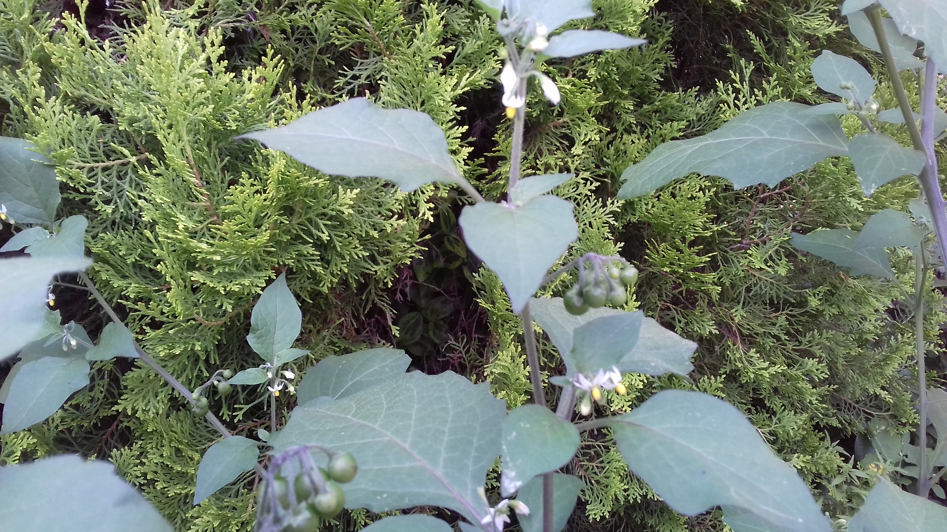 eine Solanum-Art, häufig ist Solanum nigrum (Schwarzer Nachtschatten). Einfach mal abwarten, welche Farbe die Beeren annehmen, wenn sie ganz reif sind. Die Pflanze ist tatsächlich giftig.