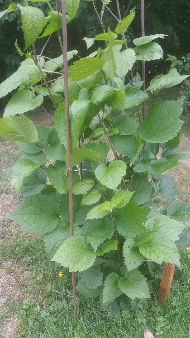 Könnte es eine bodendeckende Hortensie sein? ist bei uns dem Rasentrimmer zum Opfer gefallen, obwohl ich auch lauter stäbe rundherum gesteckt hatte. Diese Art wächst aber ganz dicht auf dem Boden. Also wäre das Hochbinden gegen ihre Natur.