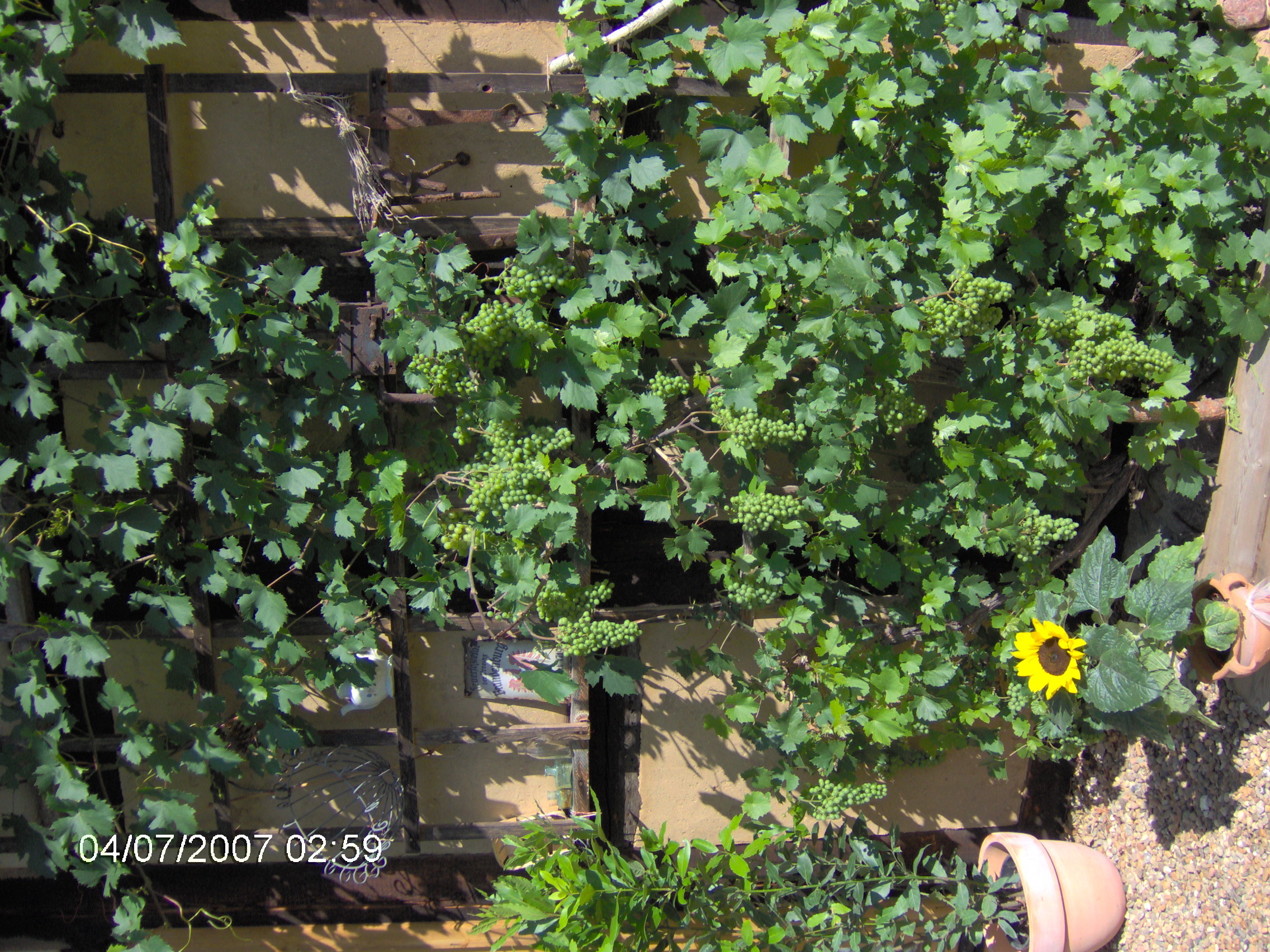 ja so siehts schon gut aus, aber es sind zuwenig Gitter. Wein wächst wie Unkraut, auch wenn man ihn im Januar/ Februar auf Zapfen (also kurz) schneidet! Möglichst vor dem Saftfluss (selbst im Januar tropfen die Schnittstellen schon, jedenfalls bei mir) ist auch komplette Südseite). Lies Dich mal schlau.