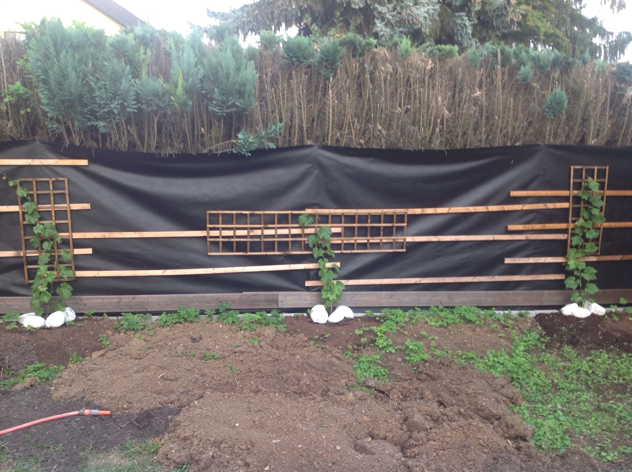 Ich hätte bei den drei Stöcken wenigstens 8 senkrechte Gitter nebeneinander angebracht. Was soll das quere Gitter? willst du Dir andauernd die schwarze Folie darüber ansehen? Der Wein hangelt nach Halterungen, im Notfall nimmt er sich selbst, aber er will nach oben!