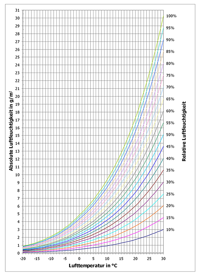 Jede bunte Kurve steht für eine relative Luftfeuchtigkeit in Prozent. Das Maximum, also 100% gibt ab, wieviel Wasser die Luft bei einer bestimmten Temperatur aufnehmen kann. Bei 0°C sind es nur etwa 4,5g/m³, bei 30°C schon 30g/m³.
