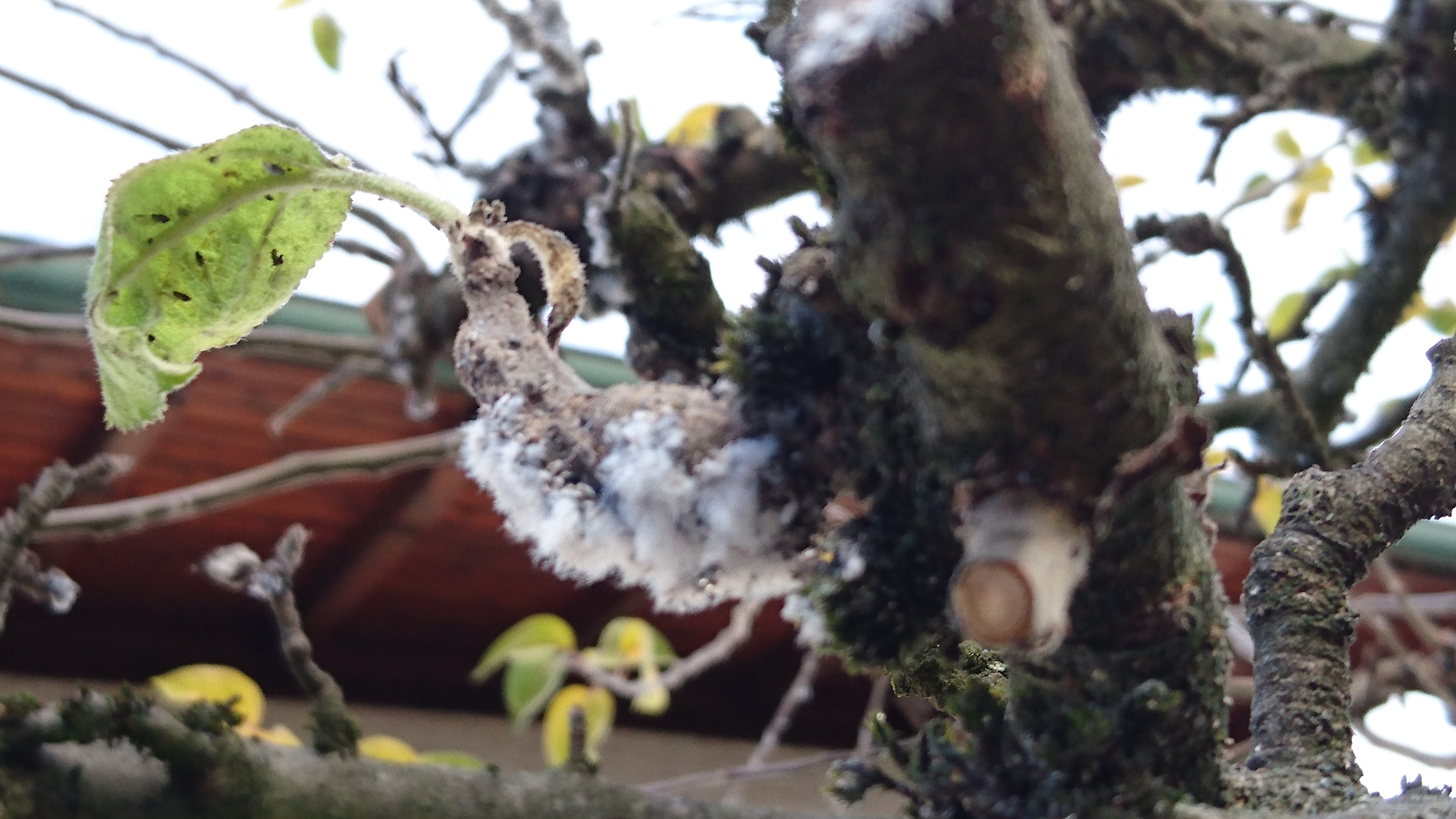 An einem meiner Apfelbäume ist ein Weißlicher Befall zu erkennen.