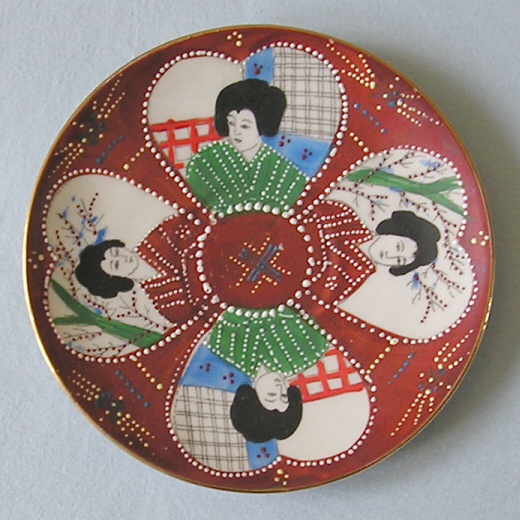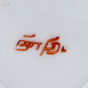 es handelt sich um die Porzellanmarke auf einem älteren Teeservice mit japanischen Motiven. Ich weiß nicht einmal wo oben und unten ist. Deshalb verlinke ich hier zwei Versionen des Schriftzuges, damit sich niemand den Hals verrenken muss…