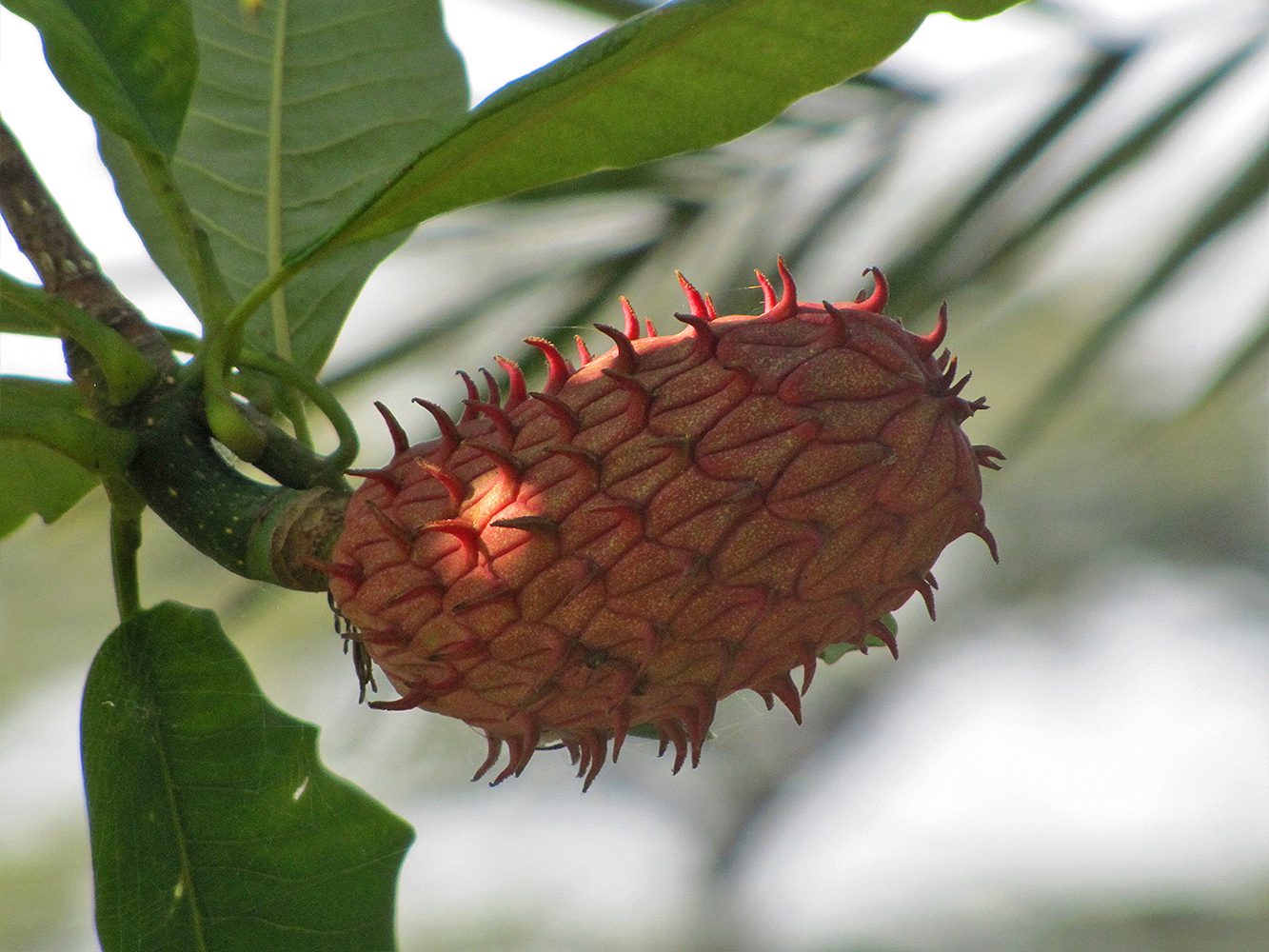 die einzeln stehende, aufrechte Frucht, ihre längliche Form und der dicke Zweig, auf dem sie sitzt, spricht dagegen. Wenn man ein Blatt vollständig sehen könnte, wäre die Entscheidung Magnolia vs. Litchi sinensis eindeutig zu treffen.