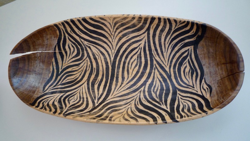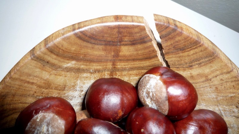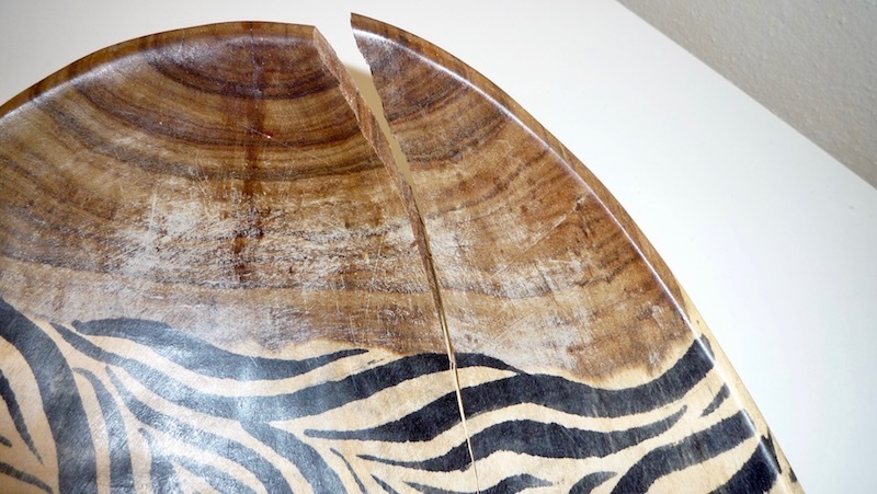 Zur Dekoration habe ich Rosskastanien gesammelt und diese über Nacht in eine ovale Schüssel aus sehr hartem, afrikanischem Holz gegeben. Nach einigen Stunden begann die Schüssel an einem Ende zu springen. Am nächsten Tag war die Schüssel an beiden Enden gesprungen, an einem Ende war der Sprung extrem weit. (siehe Bilder).