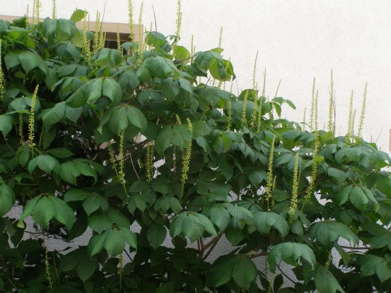 Vorgestern begegnete mir dieses stattliche Gewächs, das mir völlig unbekannt ist. Es ist etwa 2,5 m hoch, steht in einer Innenstadt und beginnt gerade zu blühen :