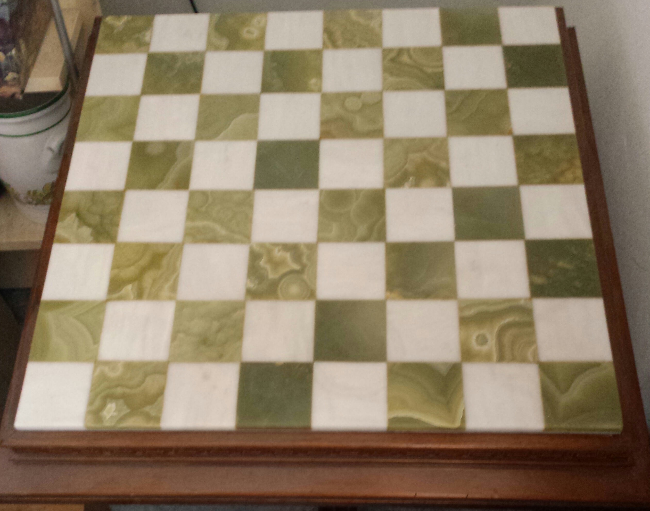 Die Tischplatte ist aus einer Art Gestein (welches?), sehr schwer und hat die Maße 55x55 cm (reine Spielfläche 48x48 cm), Höhe des Tisches ist 54cm. Der Fuß sieht gedrechselt aus. Die Tischplatte ist von unten getackert. Leider sind keine Aufkleber, Stempel o.ä. vorhanden somit ist kein Hersteller erkennbar.