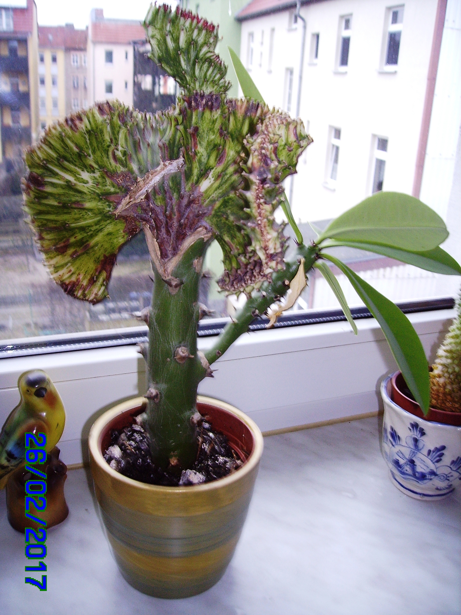 Ansonsten gehe ich mit dir einig, dass das eine Euphorbia ist - die abgebildete Pflanze habe ich hier gefunden - ist übrigens nicht nur bestrahlt, sondern auch noch gepfropft - also eigentlich zwei verschiedene Arten.