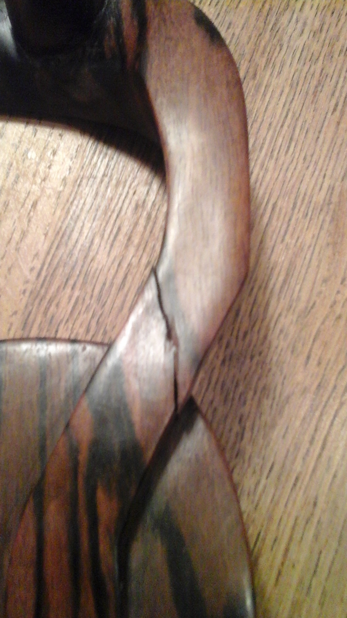 Der Riss ist soweit gediehen, dass ich heute eher aus Zufall beim Einreiben mit etwas Olivenöl auch auf der noch nicht durchgerissen Rückseite die Bewegungen auf der Vorderseite deutlich spüren konnte. Muss da also was tun.