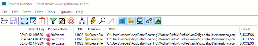 Mein erster Versuch war grade, nur Ereignisse mit Operation ist gleich CreateFile anzuzeigen. Das funktioniert nicht richtig, da werden auch andere Dateioperatonen angezeigt. Aber gut, dann ein zusätzlicher Filter: Pfad ended auf json