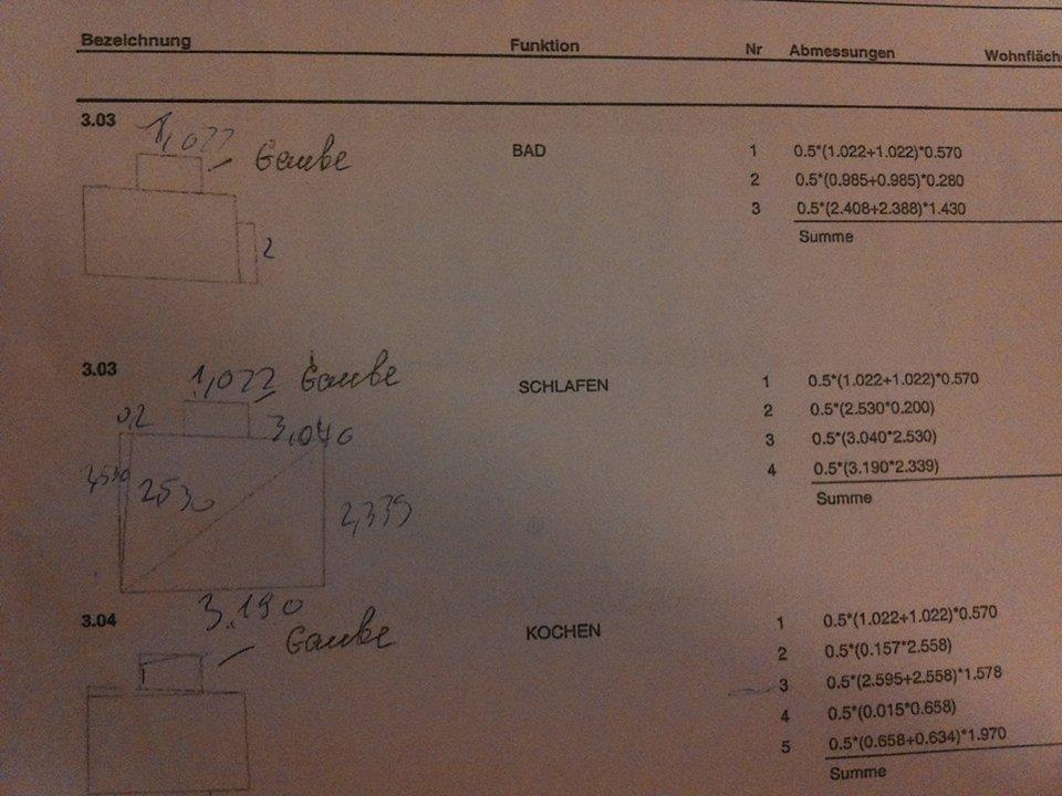 Wenn der Grundriss tatsächlich so schief wie von dir angedeutet ist, dann machen die letzten drei Zeilen der Summe durchaus Sinn. Etwas merkwürdig finde ich die erste Zeile. 57cm tiefe für die Gaube klingt ja OK, aber warum zwei mal 1,022m? Gibt es anders als eingezeichnet zwei Gauben? Ist sie vielleicht doch 2m breit?
