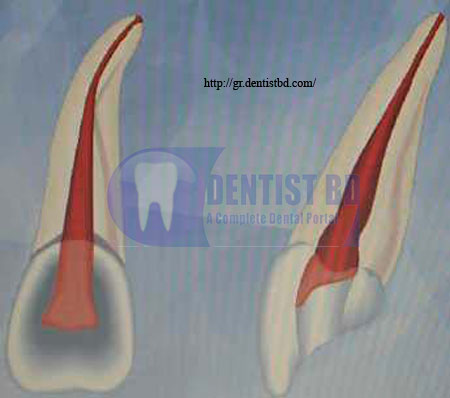 kann man ungefähr die Ausdehnung der Zahnpulpa sehen. Da ist es tatsächlich nicht leicht, den geünschten Konuswinkel hinzukriegen, ohne sich ‚in den Nerv‘ zu sägen. Jetzt hat dieses Organ allerdings einige Fähigkeiten, die man ausnützen kann: So ein Zahnnerv kann von innen ‚Reparatur‘-Zahnbein anbauen, wenn die Außenwelt, egal ob durch bakterielles oder mechanisches Trauma zu nahe kommt.